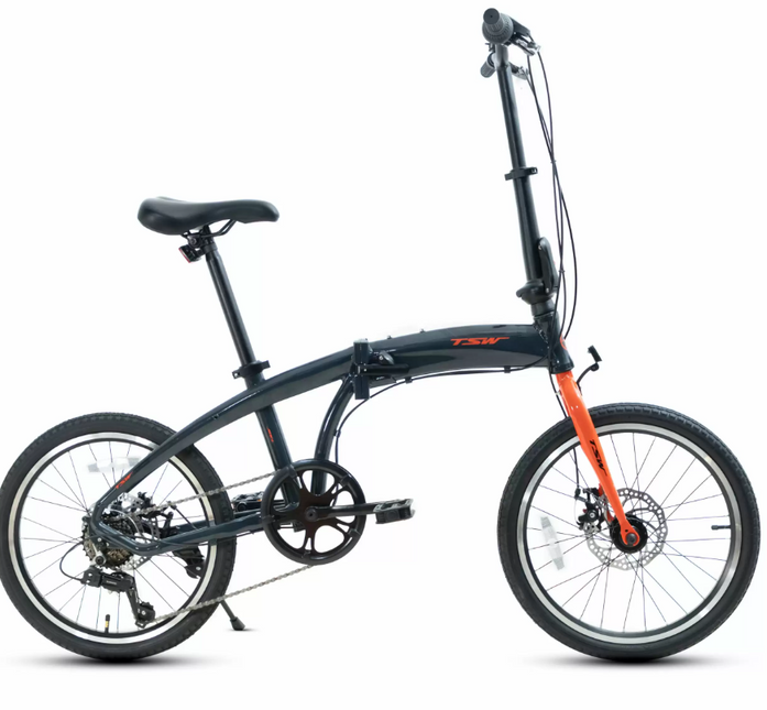 Quadro em alumínio TSW dobrável, trava de segurança na articulação; suporte de caramanhola. Direção mega over. Freio a disco mecânico. Descanso lateral. Garfo rígido.