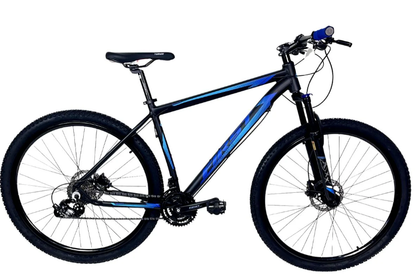 Quadro em alumínio First; 21 marchas; Alavancas de câmbio com maçanetas - Importado; Câmbio traseiro TZ3 - Shimano. Câmbio dianteiro FD6 - Logan; Roda livre 7V Index 14/28 dentes - Importado;